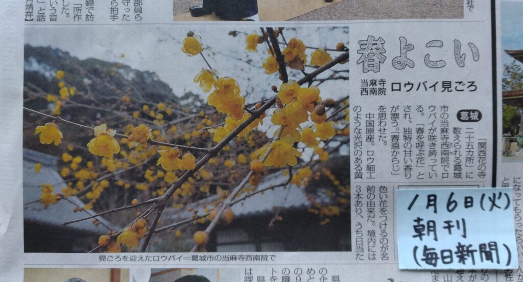 本日1月6日(火)毎日新聞朝刊に当院のロウバイの花が掲載されました。